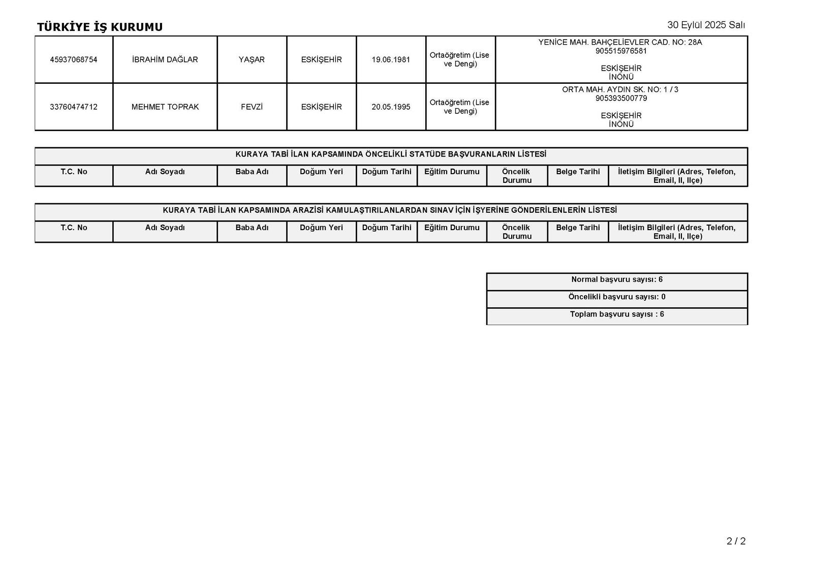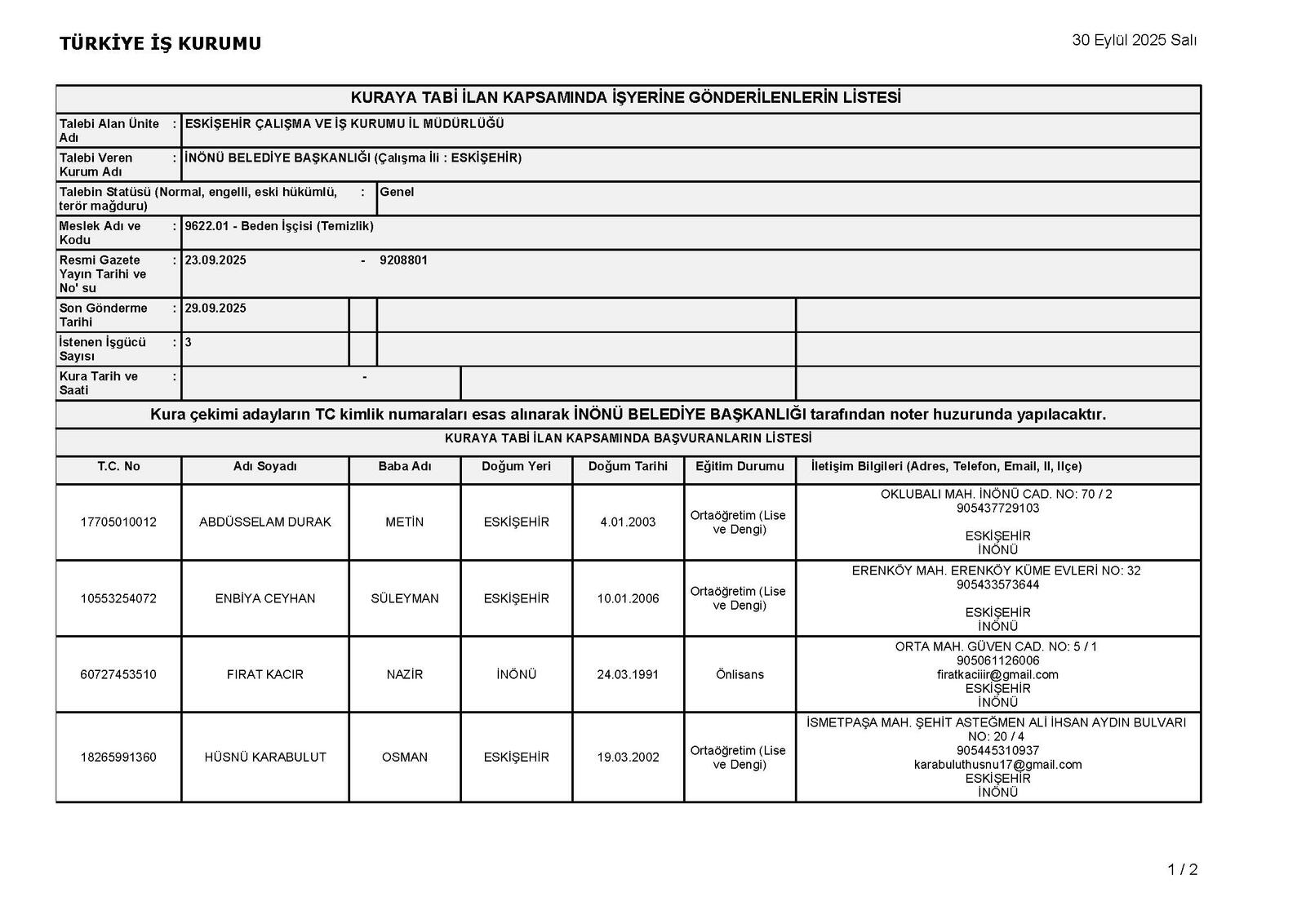 adet Temizlik işçisi alımı yapılacak olup, ilan Eskişehir çalışma ve İş Kurumu İl Müdürlüğüne gönderilmiştir. Bu ilana istinaden Nihai ilan listesi aşağıdaki tabloda bildirilmiştir. İlana 6 Kişi başvuruda bulunmuştur. Buna istinaden katılımda bulunan kişilere mülakat sınavı 01.10.2025 tarihinde saat 09:00' da İnönü Belediyesinde yapılacaktır. İlanen Duyurulur.